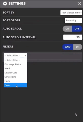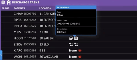 Discharge Tasks: Under the Tasks column, there are a variety of task icons that illustrate the potential barriers preventing a patient from being discharged. Examples of tasks include waiting for an ultrasound, lab results, or physical therapy, among others. The tasks displayed on the Discharge Barriers tile were chosen because they were shown to be the biggest source of delay in the discharge process. Staff may apply filters to the tile to view patients they are interested in by ward, level of care, discharge status, service line, flags or tasks. For unit managers, they can filter the units or wards that they are in charge of. If for example, a radiology manager is using the tile, they can select for tasks that are radiology related, such as MRI, X-Ray, and CT. The list is then filtered down to only those patients that have radiology-related discharge tasks that are outstanding.