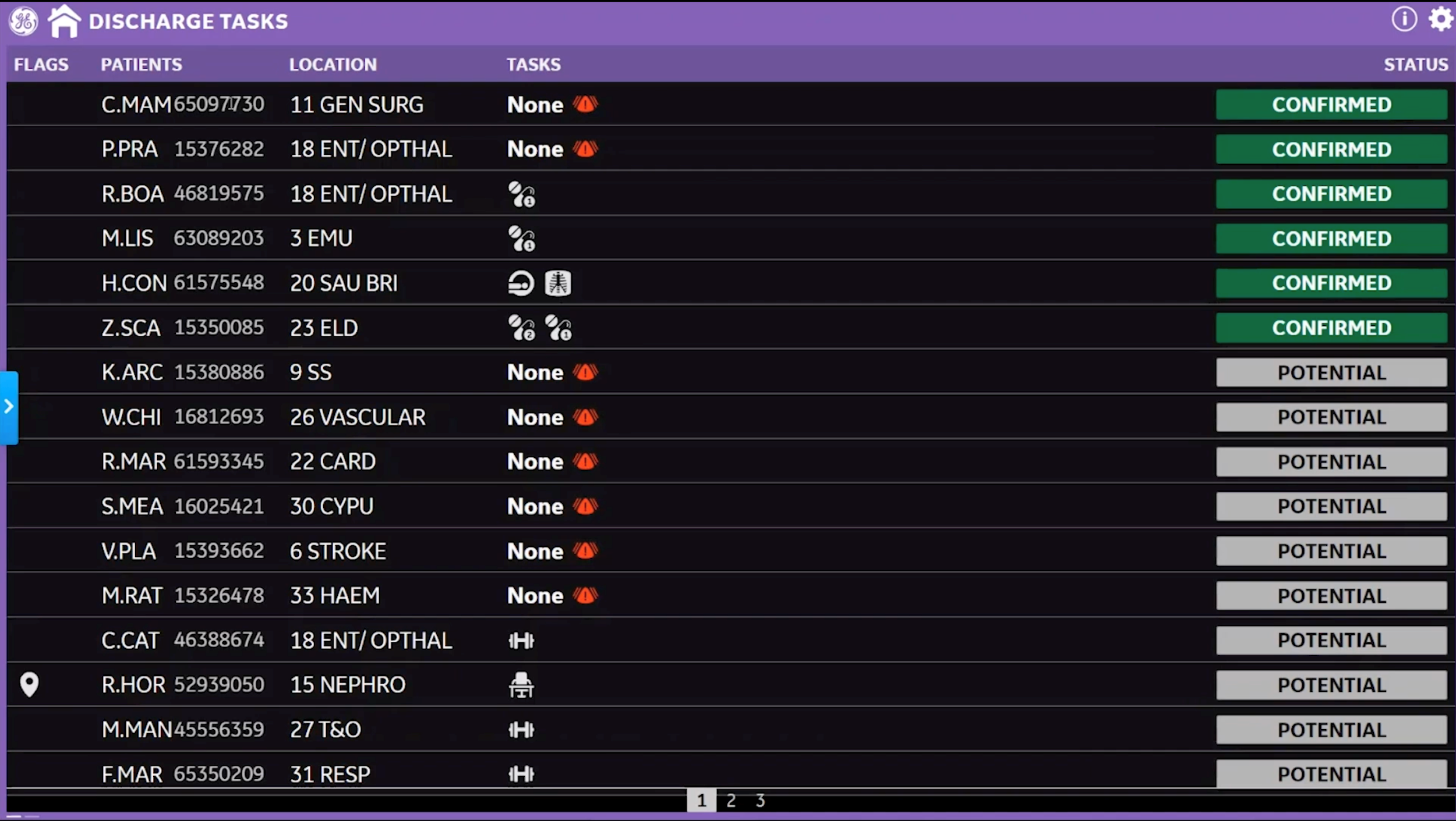 Tile Overview: On the tile, each row details a patient’s identification, their location within the hospital, pending tasks, and their discharge status. This provides a quick overview of what each patient requires for discharge so that staff, team leaders, in particular, can coordinate with their team members and edit their worklists as effectively as possible. This is especially important for freeing up capacity within the Emergency Department (ED) and Operating Room (OR) that concerns urgent care patients. A green “Confirmed” status icon prompts patients that should be discharged today, whereas the grey “Potential” icon represents patients that could be discharged today or tomorrow. In the example above, the first patient has no outstanding tasks and may be discharged immediately.